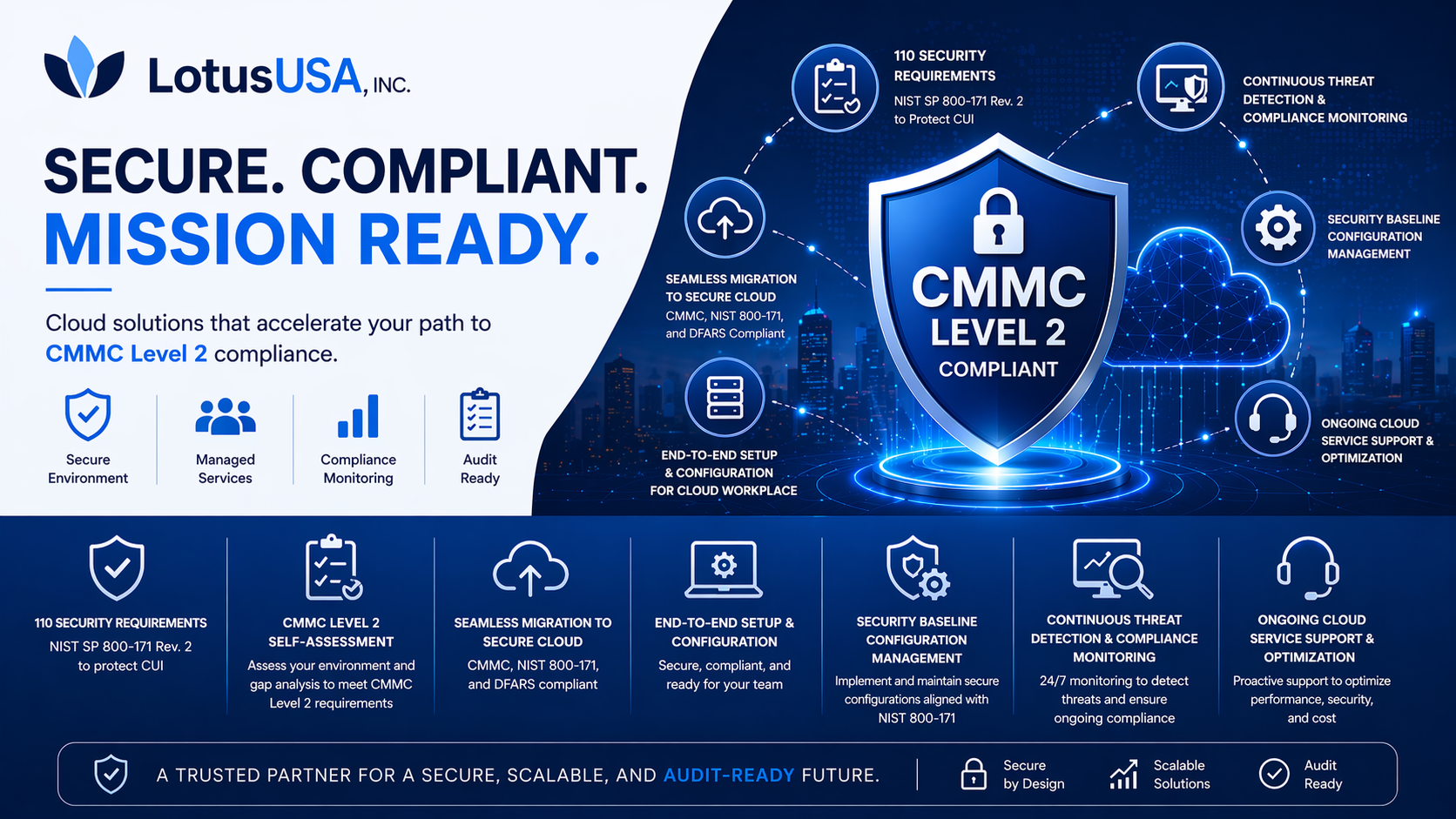 LotusUSA, Inc. achieved CMMC Level 2 Readiness on March 6, 2026, reinforcing our deep expertise in cybersecurity compliance and federal contracting.